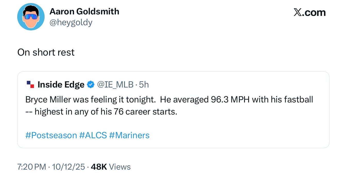 After emptying the clip to win one of the greatest games in franchise history and move to their first American League Championship Series in 24 years, it’d be Bryce Miller on three days rest up against a Blue Jays offense fresh off broadsiding the Yankees to the tune of 8.5 runs per game.