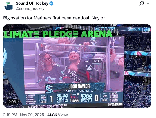 It’s a good time to savor the softer side of life, like Josh Naylor positively beaming when shown—to raucous applause and his walk-up song on the organ—on the big board at a Kraken game last week.