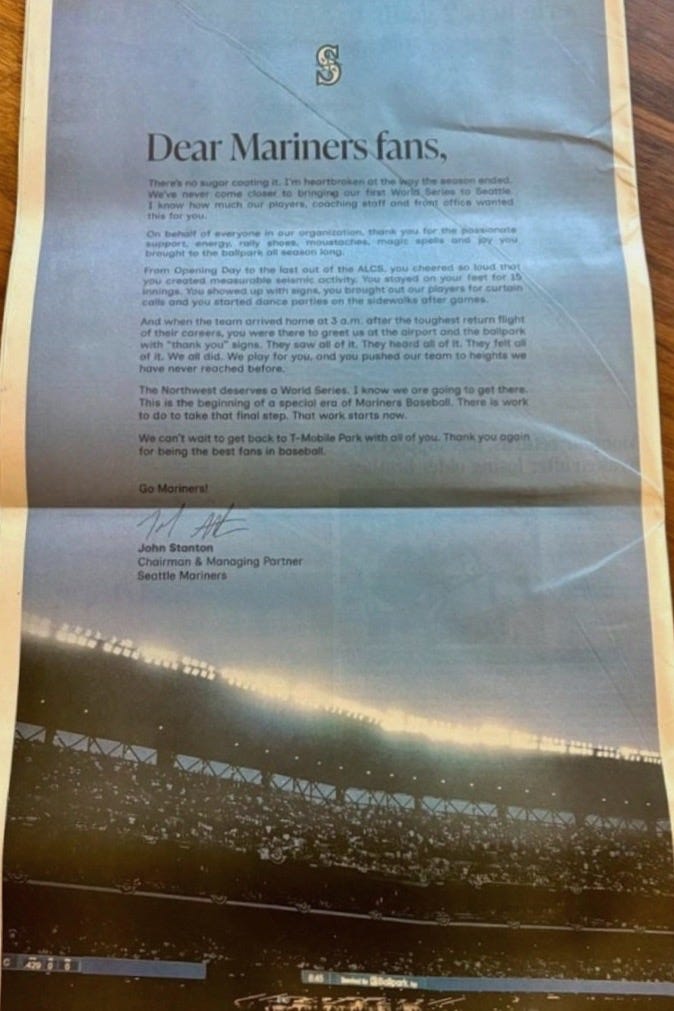 The last time we heard from Seattle Mariners ownership, it was in a full-page ad in The Seattle Times with a letter signed by John Stanton.