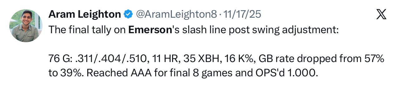 Defensively the arrow is up. Fully healthy from the fractured foot that sidelined him during the summer of 2024, Emerson looked much more spry at shortstop in 2025. His range was better, but he’d also progressed on some of the little things, like his footwork around the bag, getting the ball out quicker, and charging more aggressively. His ability to grow in real time is remarkable. More than once, Brendan saw him either misplay something or take an imperfect angle in a game on Tuesday, and then handle the same ball perfectly three days later. It’s this as much as anything driving the defensive projection. We’ve long been skeptical that Emerson would be able to stay at short with his size and speed, and still think there’s a good chance he needs to move to third base at some point, but for now it looks like he can be average or maybe even a tick better there.